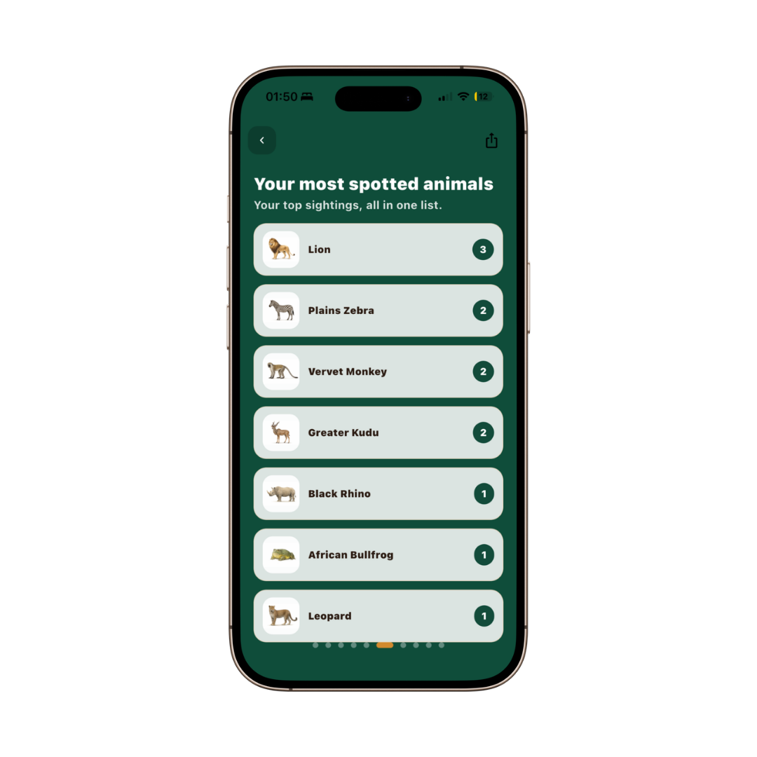 At the end of your trip, relive everything with Safari Wrapped — a personalised safari recap showing your animals, achievements, and memories from the bush